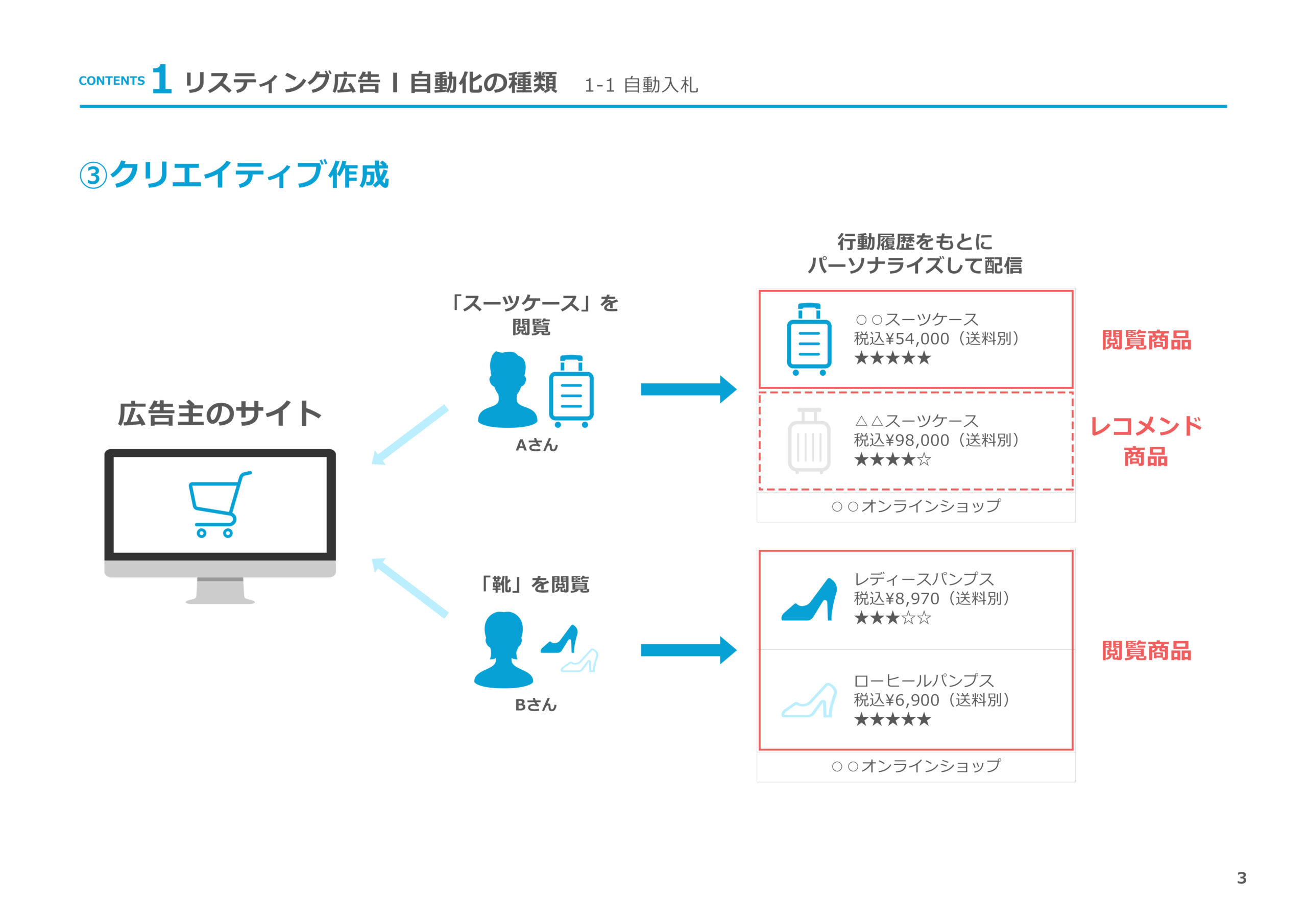 商材、ターゲットを元にして、最適な広告文や画像を自動で作成する機能です。DSA、Dynamic-X(動的リマーケティング)などがあります。