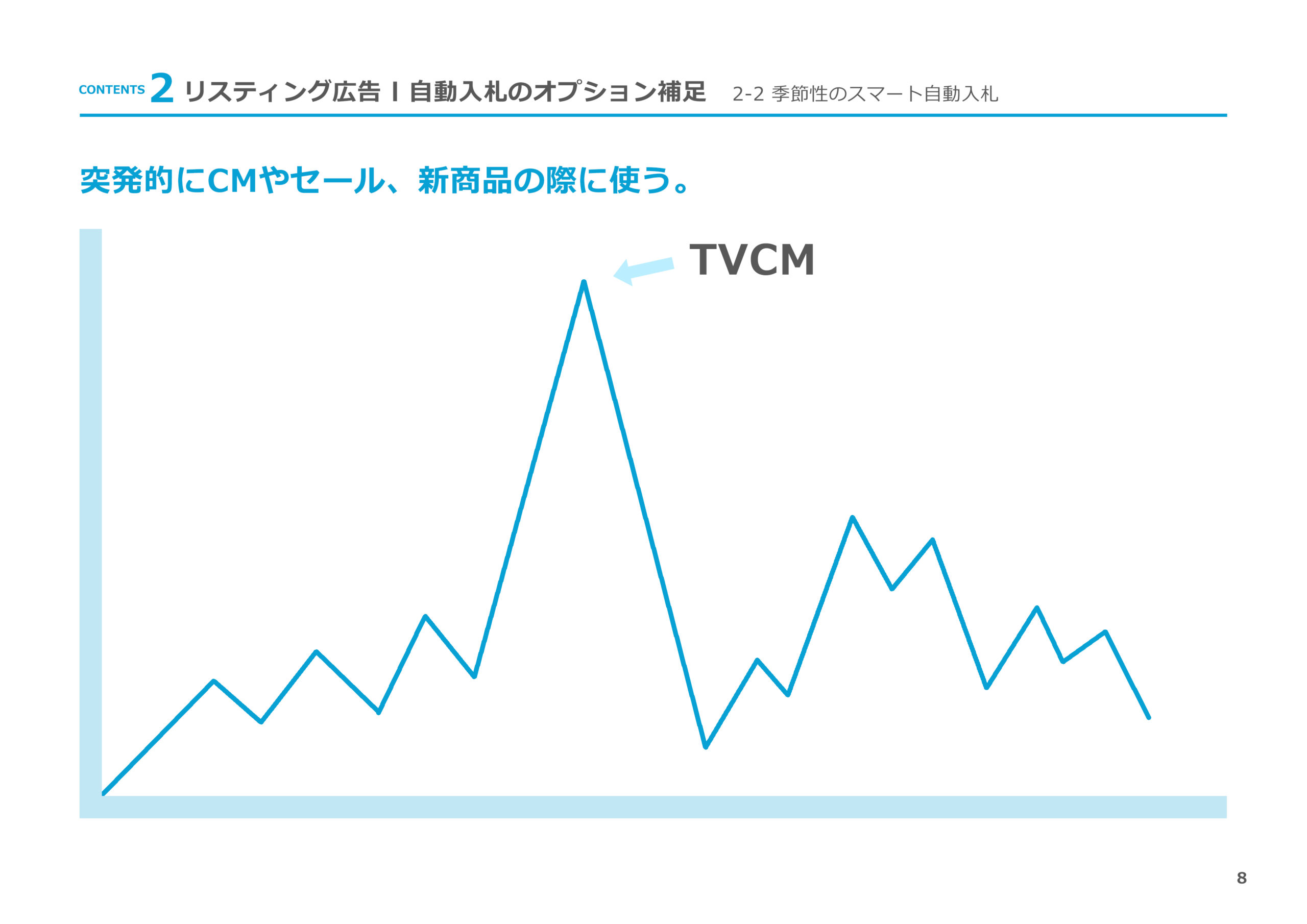 1〜7日間の短い期間での、突発的にいこるイベントのための入札戦略です。CM、セール、新商品のリリースなどの際に使います。通常のスマート自動入札の場合、突発的なイベントに対しての学習はできませんが、この機能を使用することでそれらにも対応できるようになります。