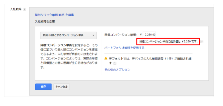 なお、以下の方法で過去のコンバージョン単価の平均に基づいた推奨される数値を確認できますので、新たに入札戦略を設定する際などはこちら参照するのがよいでしょう。