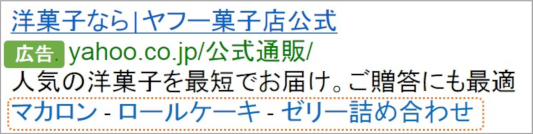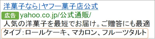 カテゴリ補足オプションはカテゴリーを選んで限定した語句を表示することで、競合他社との違いや特徴をアピールすることが可能です。