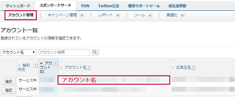 広告管理ツールの「スポンサードサーチ(検索広告)」タブをクリックし「アカウント管理」を選択してください。