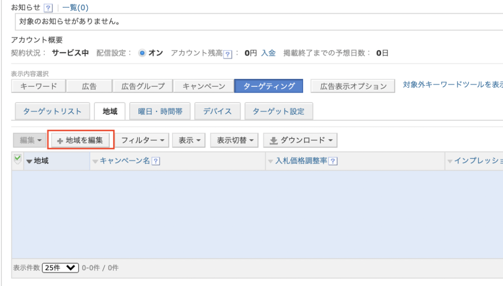まず、Yahoo!広告管理ツールをの「検索広告」タブから「ターゲティング」をクリックし「地域」を選択します。