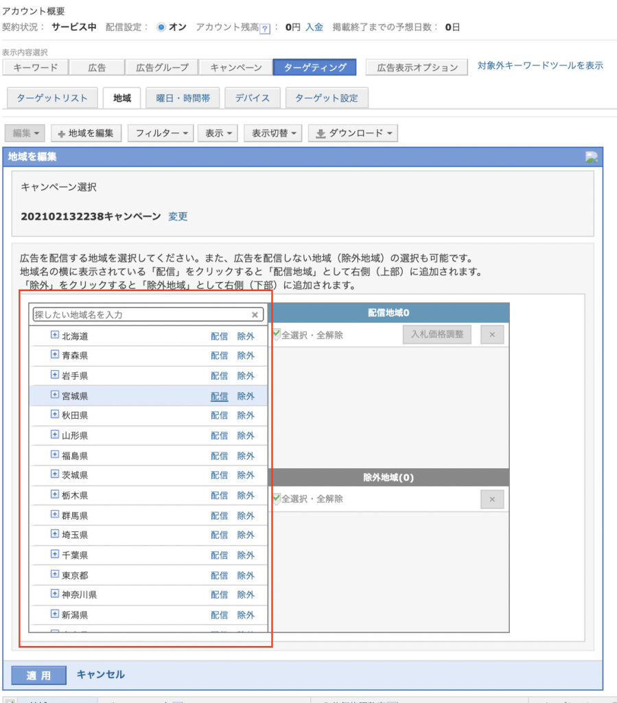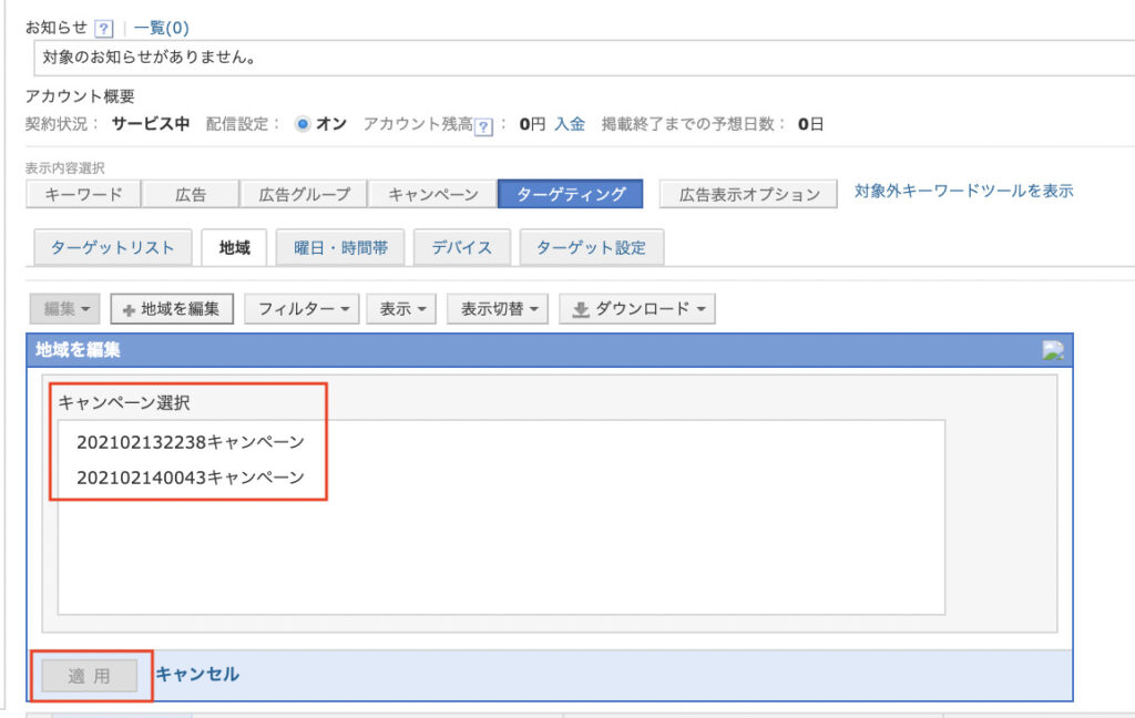 キャンペーンの一覧が出てきます。地域ターゲットを設定したいキャンペーンを選択し「適用」をクリックしてください。