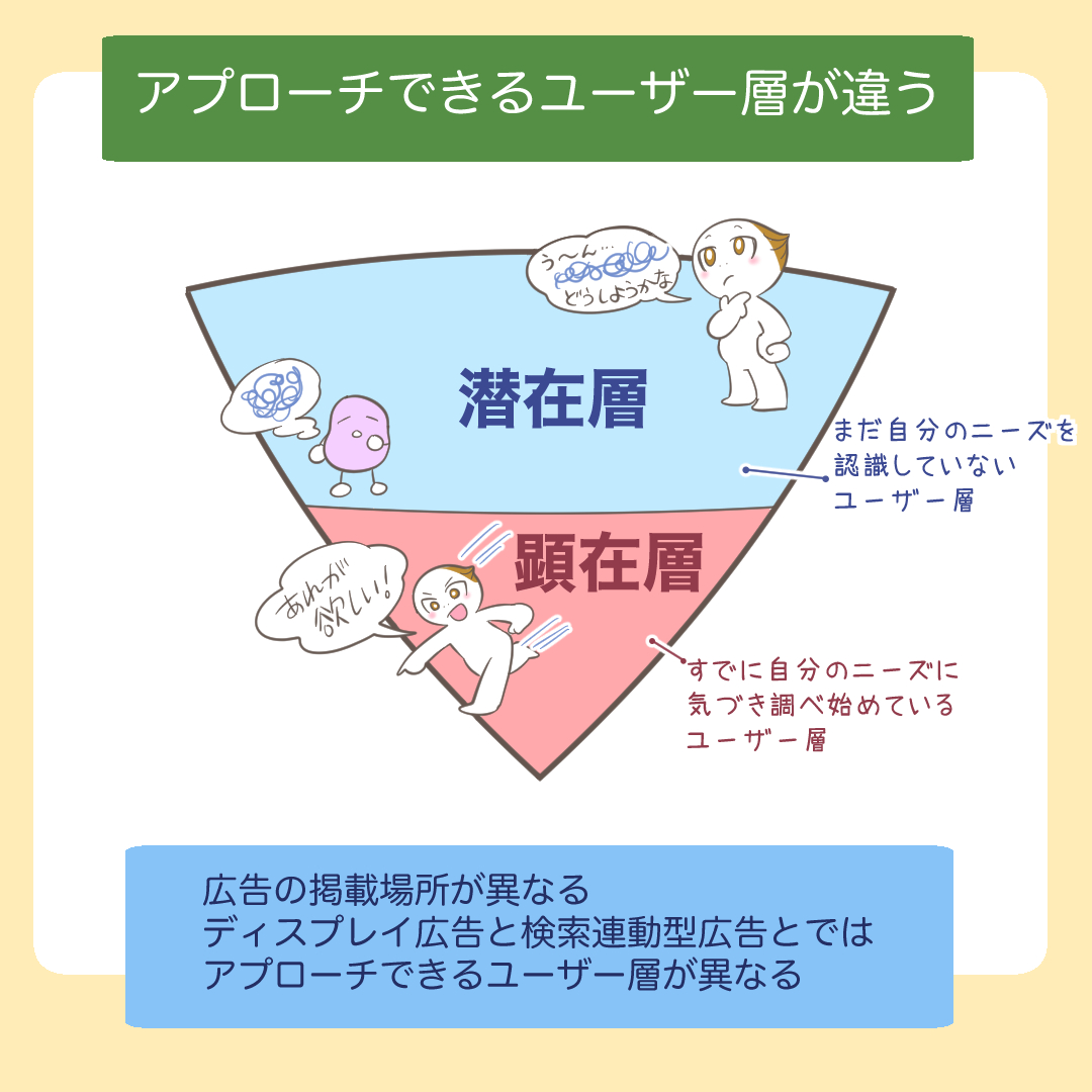 広告の掲載場所が異なるディスプレイ広告と検索連動型広告とではアプローチできるユーザー層が異なります。