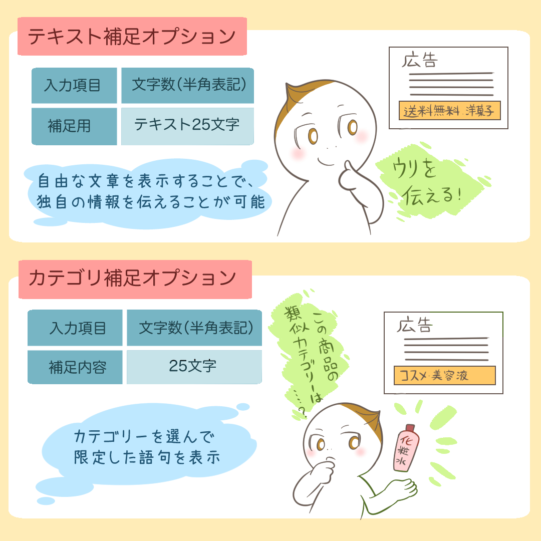 カテゴリ補足オプションはカテゴリーを選んで限定した語句を表示することで、競合他社との違いや特徴をアピールすることが可能です。