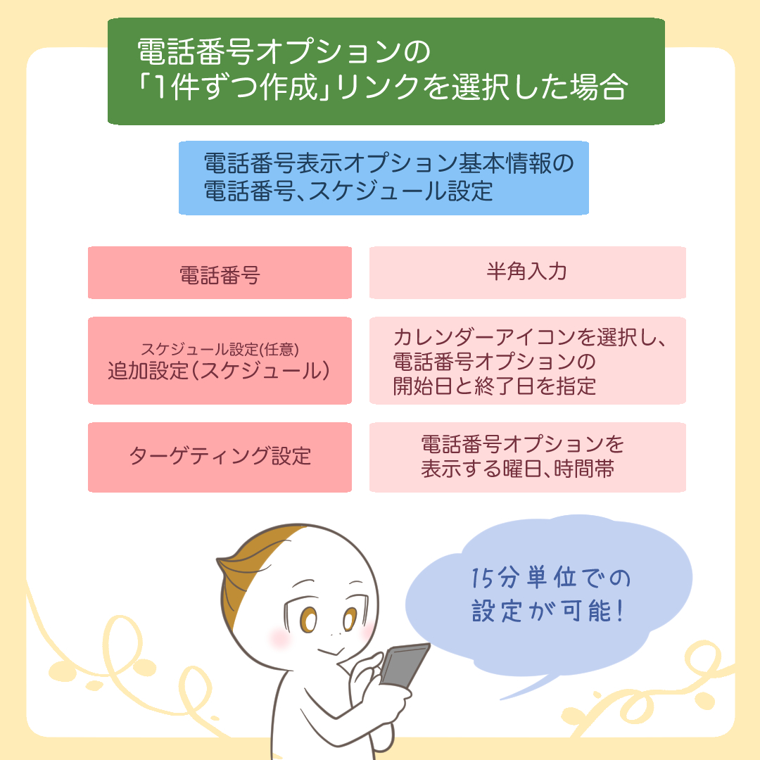 電話番号オプションの「1件ずつ作成」リンクを選択した場合