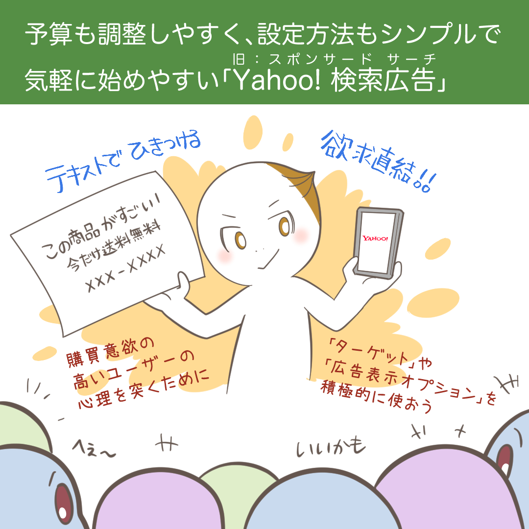 Yahoo! 検索広告(旧:スポンサード サーチ)は予算も調整しやすく、設定方法もシンプルで気軽に始めやすい広告ですね。