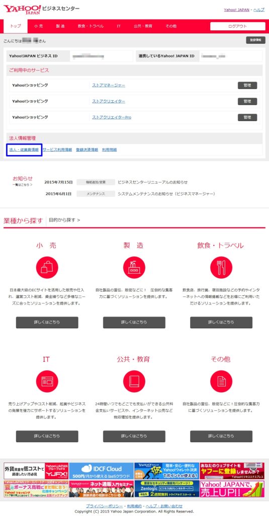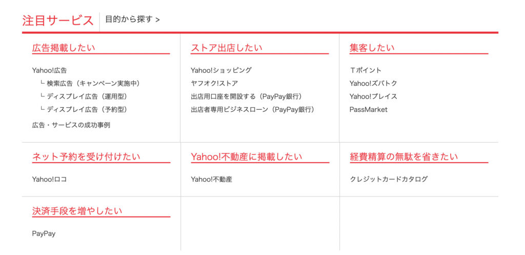 Yahoo!ビジネスセンターを開き、利用したいサービスを選択してください。