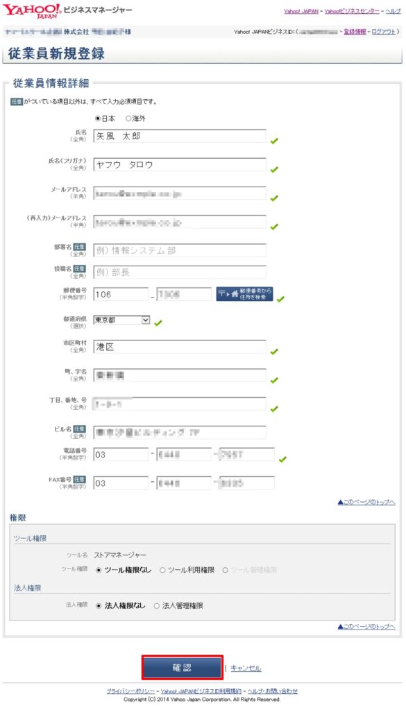 また、ツール権限(可能な場合のみ)、法人権限から、希望の権限を選択します。入力が終わったら、[確認]ボタンを押します。