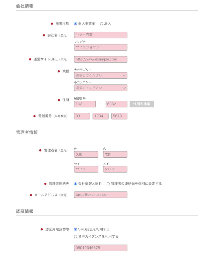 会社情報・管理者情報・認証情報を入力していきます。赤い箇所は入力必須の項目なので忘れずに入力してください。