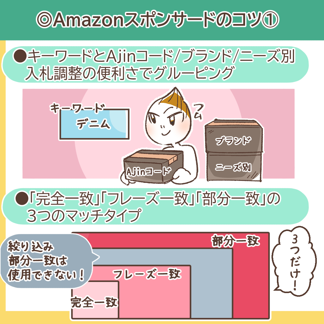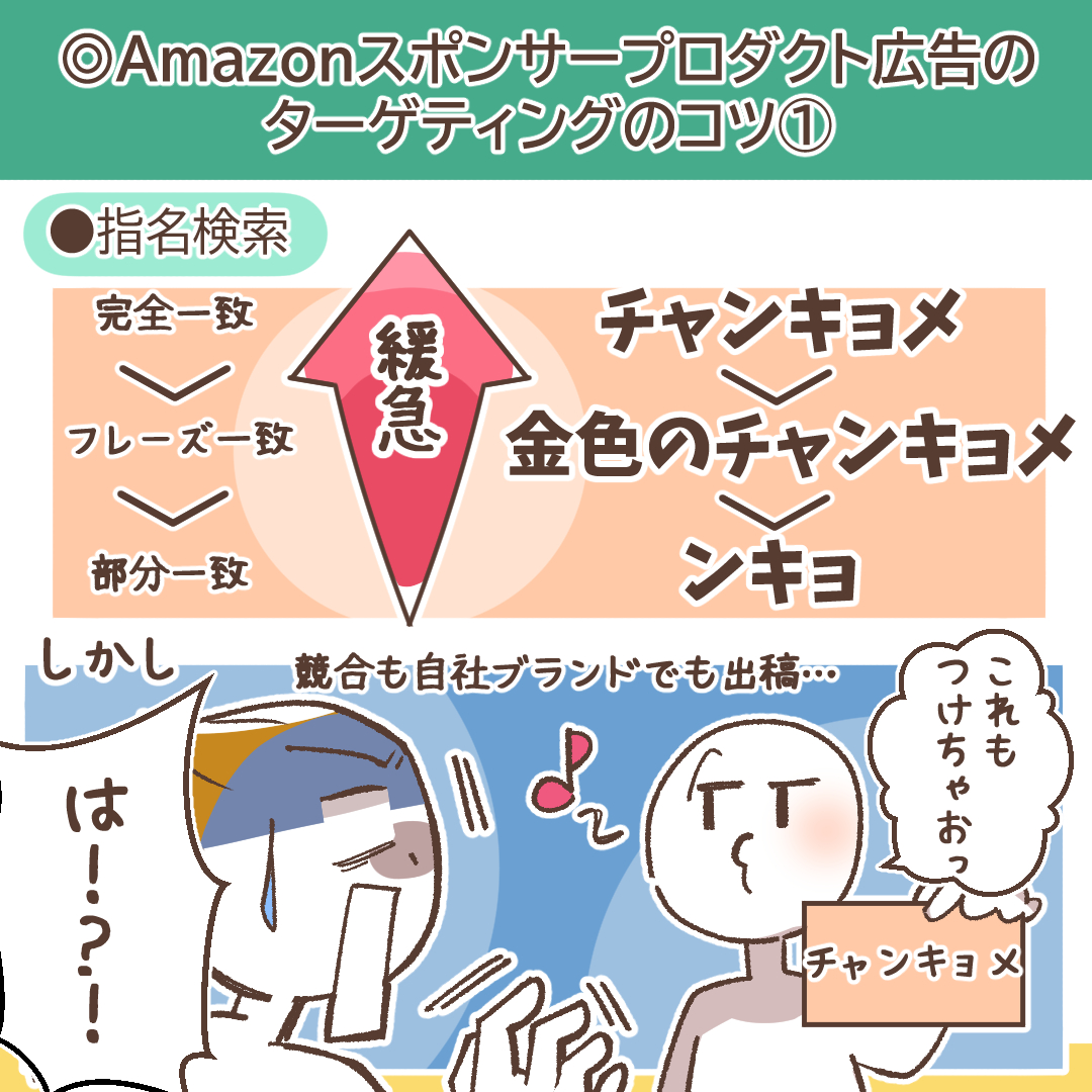 なお、Google広告などで利用できる「絞り込み部分一致」はAmazon広告には存在しないため、この3つのマッチタイプを駆使して運用を組み立てる必要があります。