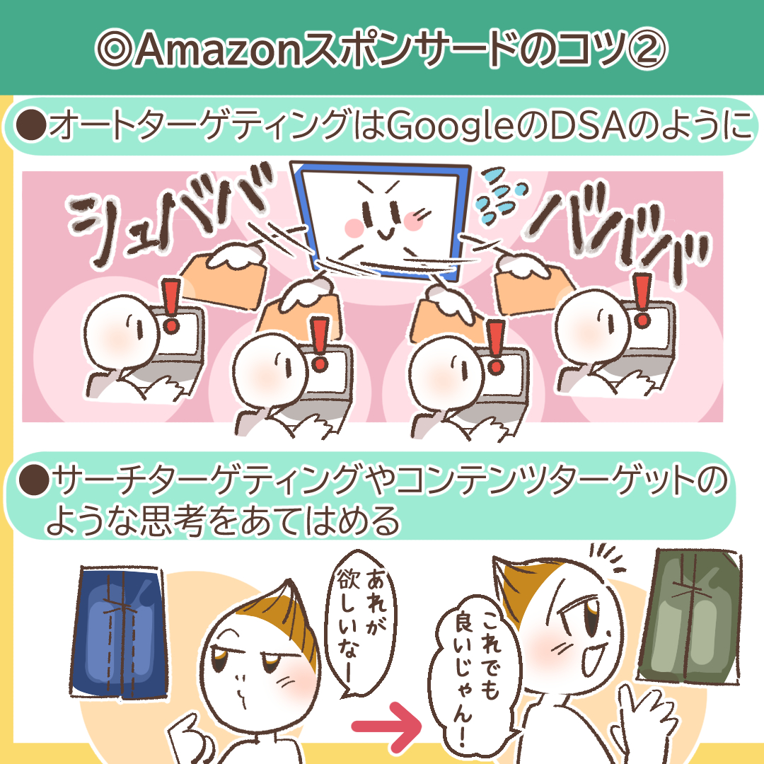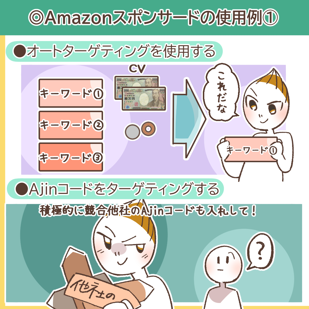 これは、マニュアルの商品ターゲティング(PAT)を駆使した戦術です。Amazon内で自社商品と競合する、あるいはレビュー評価は高いが価格も高い商品などをリストアップし、それらのASINを直接指定して広告を表示させます。これにより、競合商品の購入をまさに検討しているユーザーに対して、最後の最後で「待った」をかけ、自社商品へ誘導することが可能になります。特に、自社商品が競合よりも価格が安い、機能が多い、レビューが良いといった明確な強みがある場合に絶大な効果を発揮します。