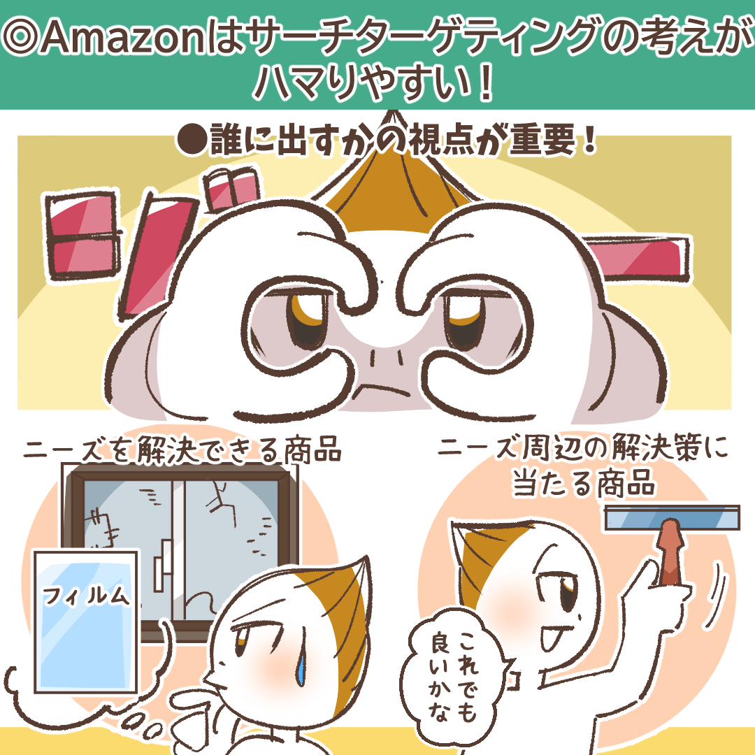 さらに、Amazon内では多数の類似商品が販売されており、顧客は常に比較検討を行っています。これは「コモディティ化」した市場と言えますが、裏を返せば、自社商品の魅力を的確に伝えることができれば、競合商品からシェアを奪うチャンスが豊富に存在することを意味します。つまり、Amazon広告、とりわけスポンサープロダクト広告の戦略は、「既に存在する明確なニーズ(検索キーワードや閲覧商品)に対して、いかに自社商品を最適な解決策として提示できるか」という、サーチターゲティング、すなわち「刈り取り型」の思考が極めて有効に機能する市場なのです。この基本原則を念頭に置くことで、以降の解説の理解度が飛躍的に高まります。