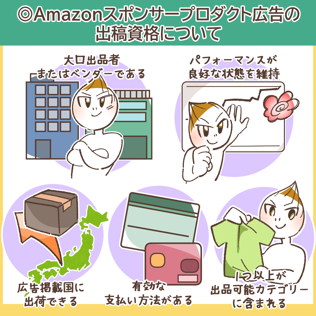 Amazonスポンサープロダクト広告を出稿するためには、以下の要件をすべて満たしている必要があります。特に重要なのは、Amazonの出品形態において「大口出品」プランを契約していることです。小口出品では広告機能を利用できませんのでご注意ください。