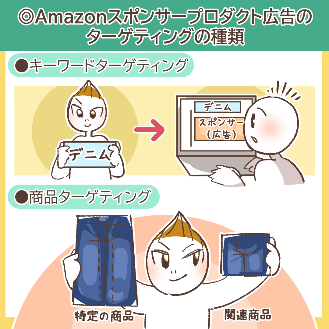 商品ターゲティングは、スポンサーディスプレイ広告と表示場所が似ているため混同されがちですが、スポンサープロダクト広告はより商品リストに溶け込んだ自然な形式で表示されるのに対し、スポンサーディスプレイ広告はバナー形式で表示されるという違いがあります。