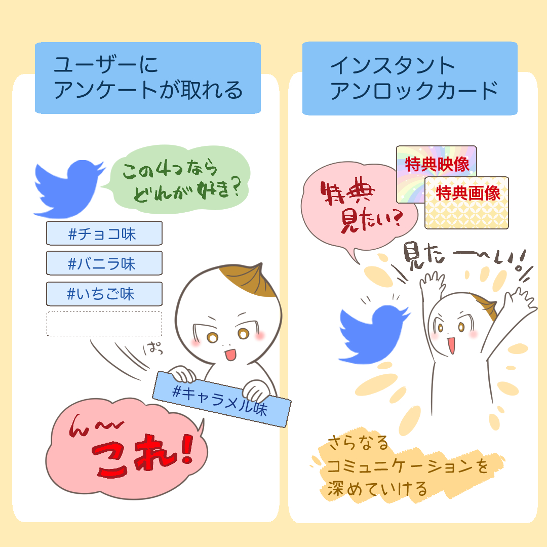 カンバセーションボタンの効果をさらに高めるのが「インスタントアンロックカード」という機能との連携です。これは、ユーザーがボタンを押してツイートを完了させることで、初めて閲覧可能になる「隠しコンテンツ」を設定できる機能です。