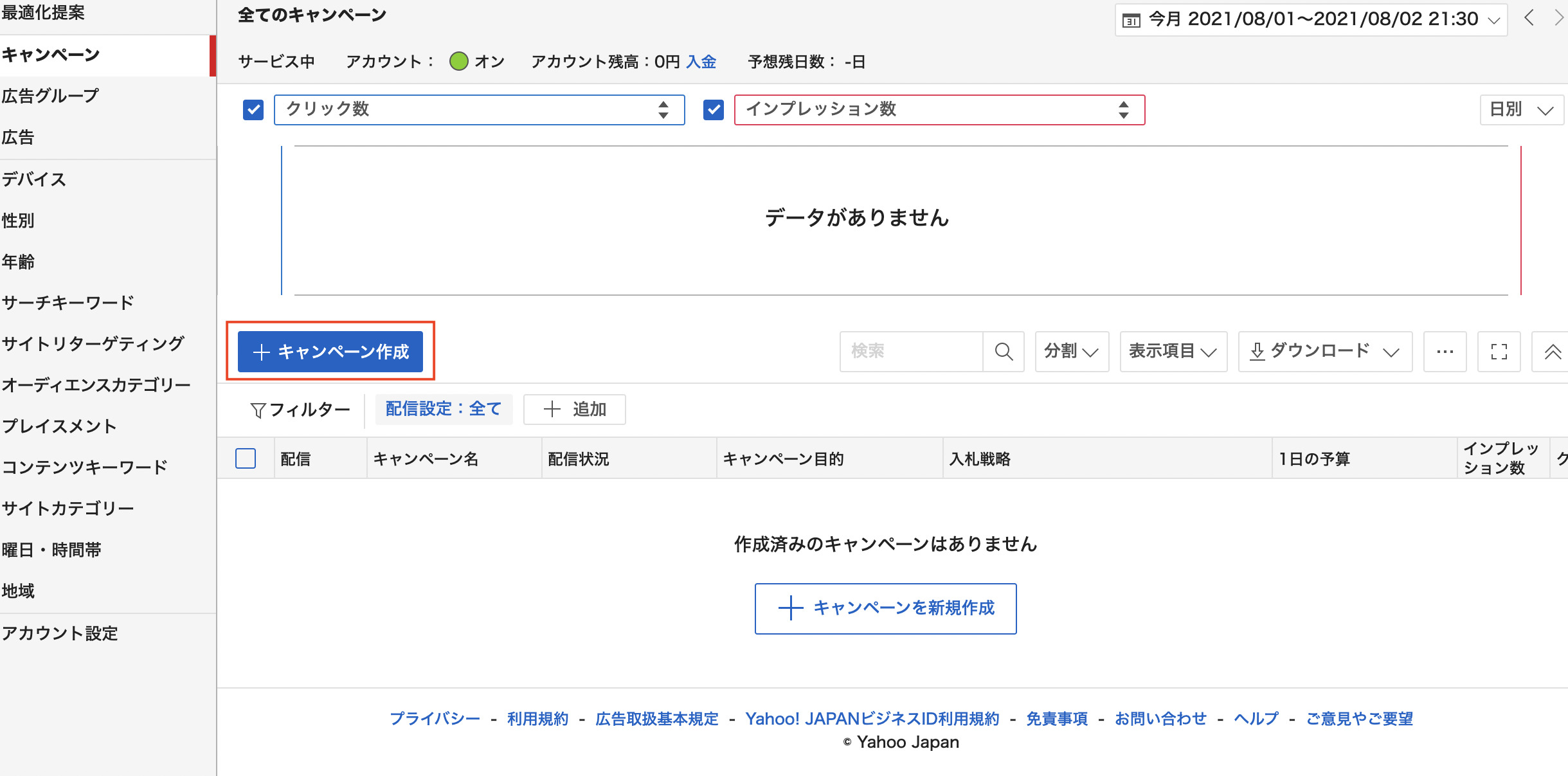 まず初めにディスプレイ広告の新しい広告管理ツールを表示し、キャンペーン一覧画面で、「キャンペーン作成」ボタンを押します。