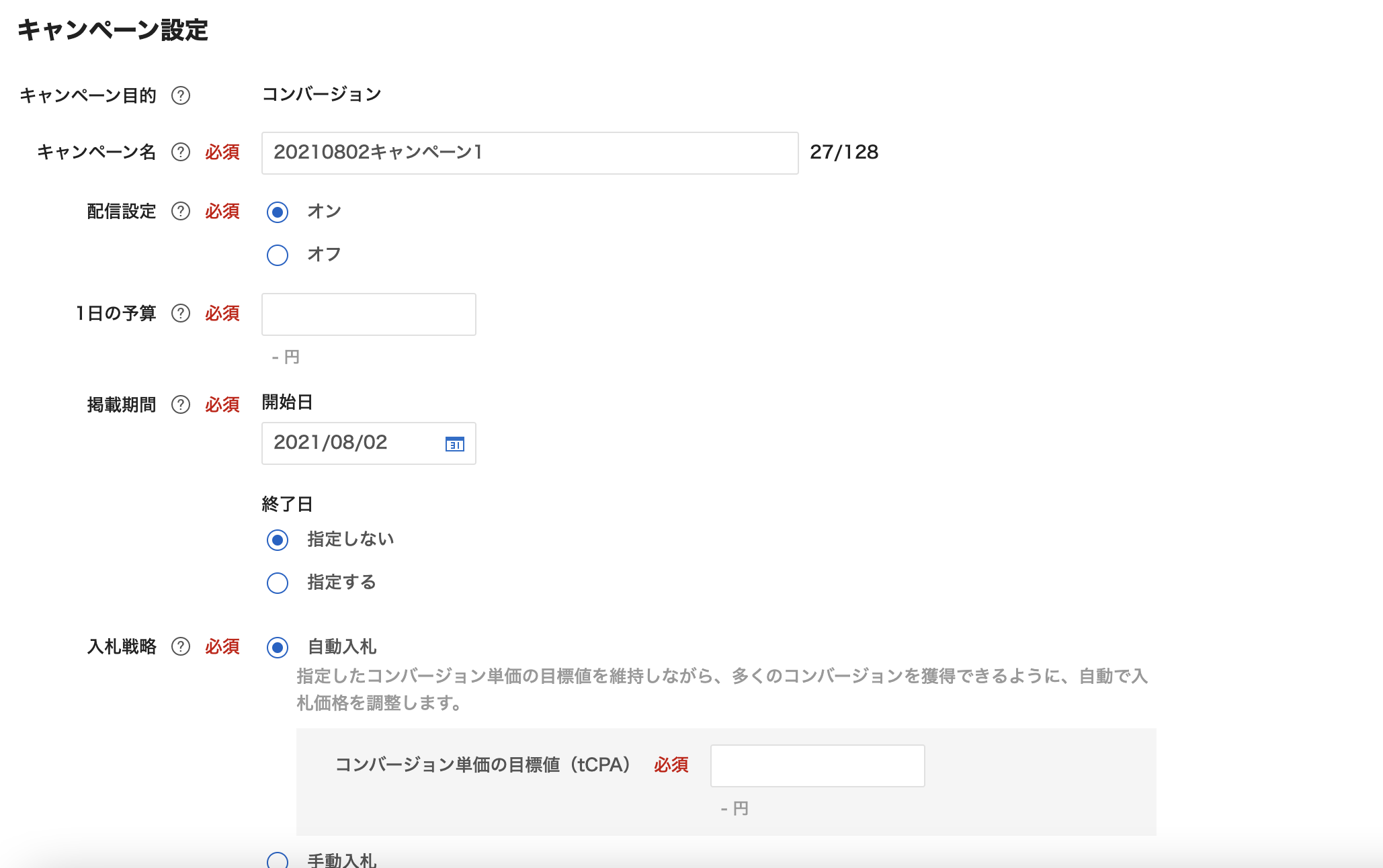 キャンペーン作成画面が表示されるので、それぞれの各項目を入力します。