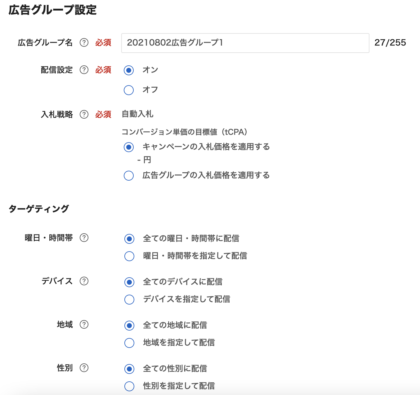 設定が終わったら、同じ画面下部の「広告グループ設定」で、広告グループを作成します。