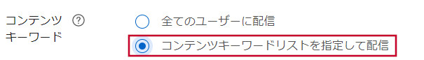 「広告グループを作成する」画面、もしくは「広告グループ設定」の編集画面にある「コンテンツキーワード」にて「コンテンツキーワードを指定して配信」を選択します。