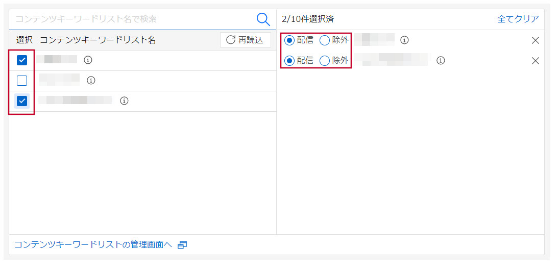 コンテンツキーワードリストの一覧から、設定するリストにチェックを入れます。選択したリストが右欄に表示されるので「配信」か「除外」を選択します。