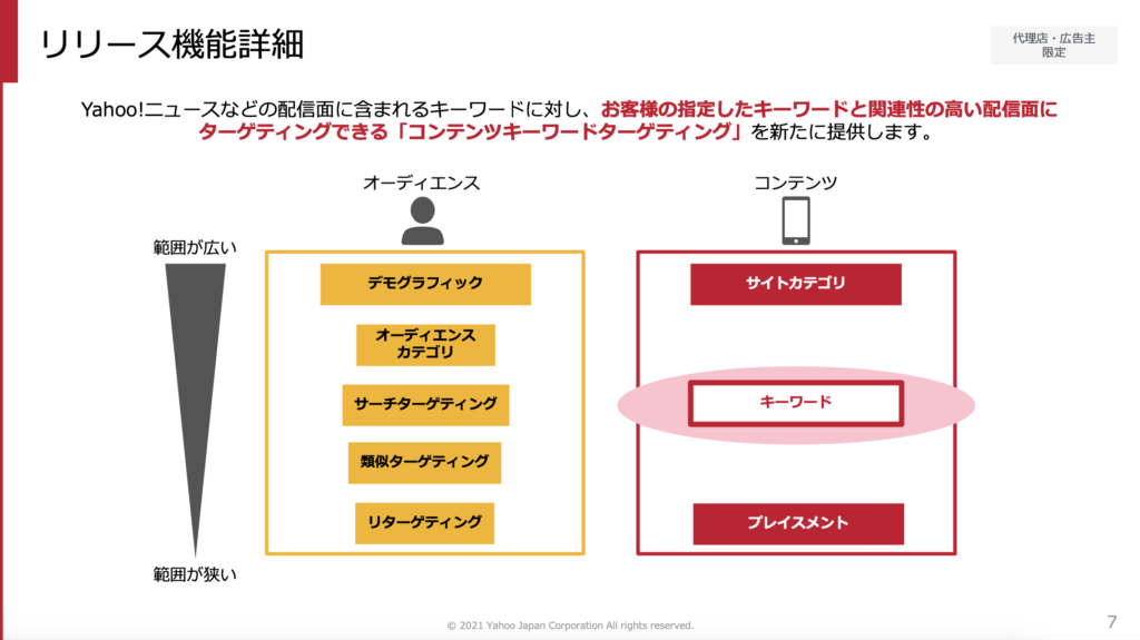 Yahoo!ディスプレイネットワーク(以下YDA)において、指定したキーワードに関連するサイトに対して広告を出稿するコンテンツターゲティングの提供が開始されます。