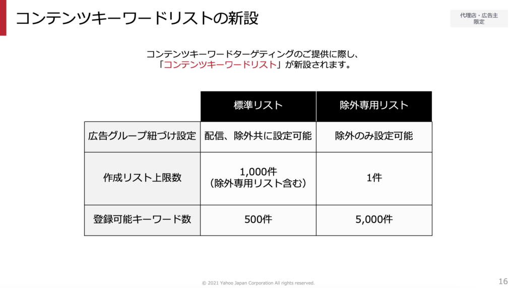 そのため、ターゲティング設定のための「コンテンツキーワードリスト」が新設されます。