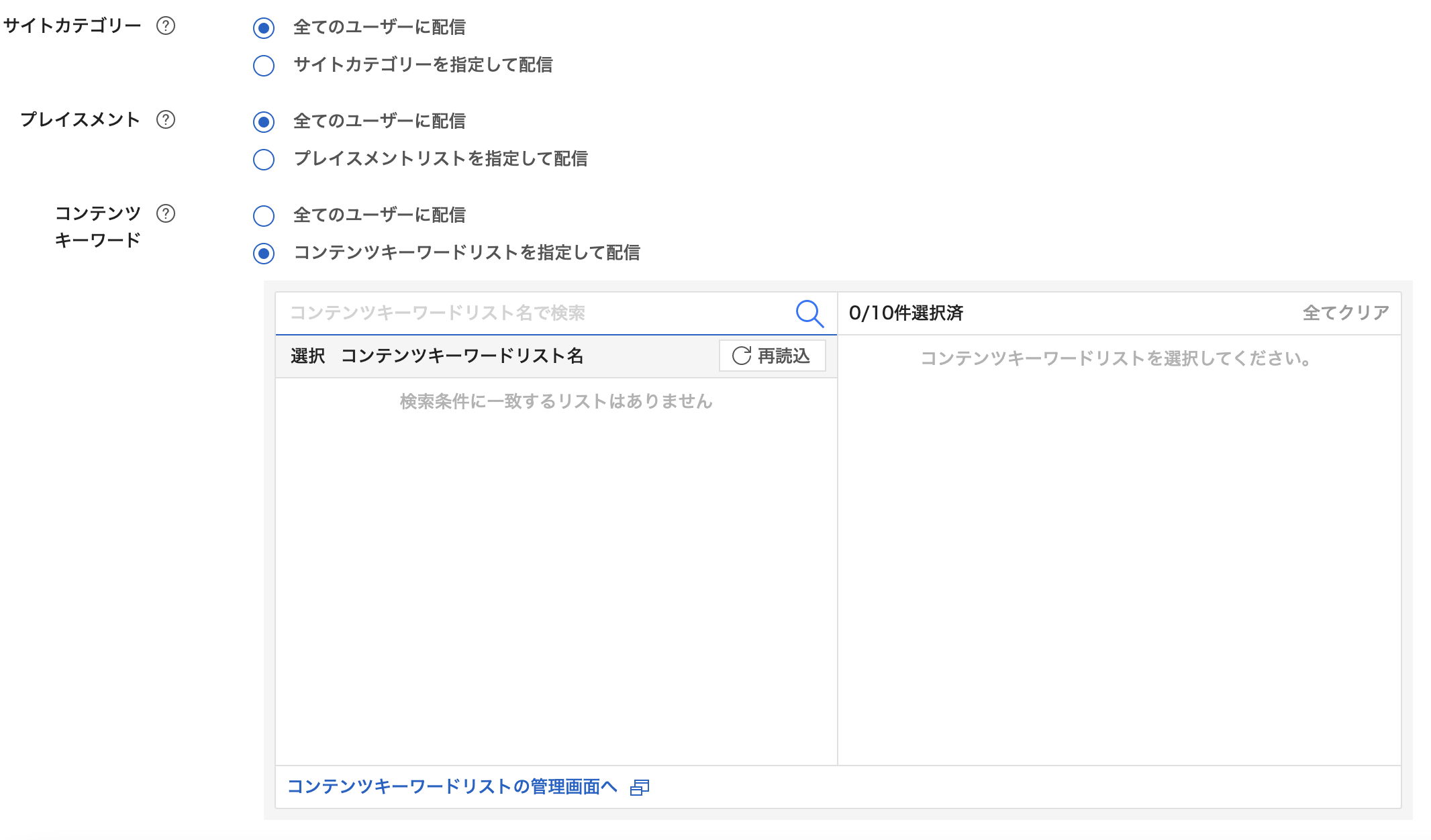 コンテンツキーワードターゲティングの提供に際して、「コンテンツキーワードリスト」が新たに新設されました。