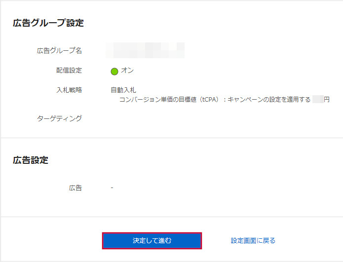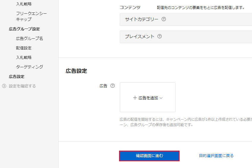広告グループの設定が終わったら、「確認画面に進む」ボタンを押します。