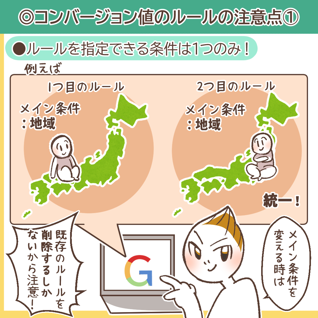 一つのGoogle広告アカウント内で作成するコンバージョン値のルールは、すべて同じメインの条件を使用する必要があります。例えば、最初にメインの条件を「地域」で設定した場合、2つ目以降に作成するルールも、メインの条件は「地域」でなければなりません。「オーディエンス」をメインの条件にしたルールを追加したい場合は、既存の「地域」ベースのルールをすべて削除してから、新しく作成し直す必要があります。そのため、どの条件を軸に価値を調整したいかを、事前に戦略的に決めておくことが重要です。