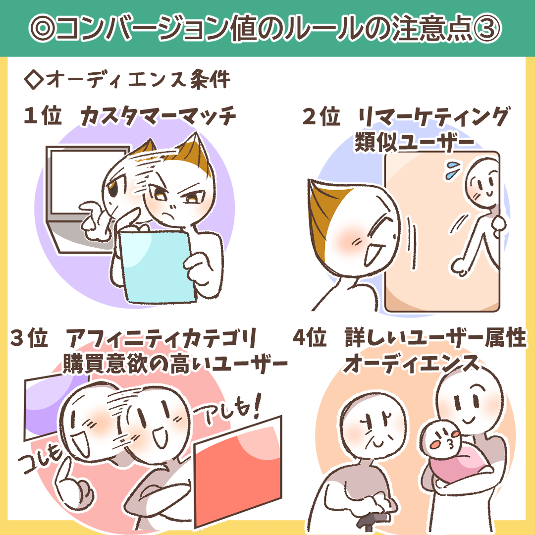 コンバージョンしたユーザーが、条件として指定された複数のオーディエンスリストに含まれている場合、以下のリストの優先順位に従って、一つのルールのみが適用されます。リストの番号が若いほど優先度が高くなります。