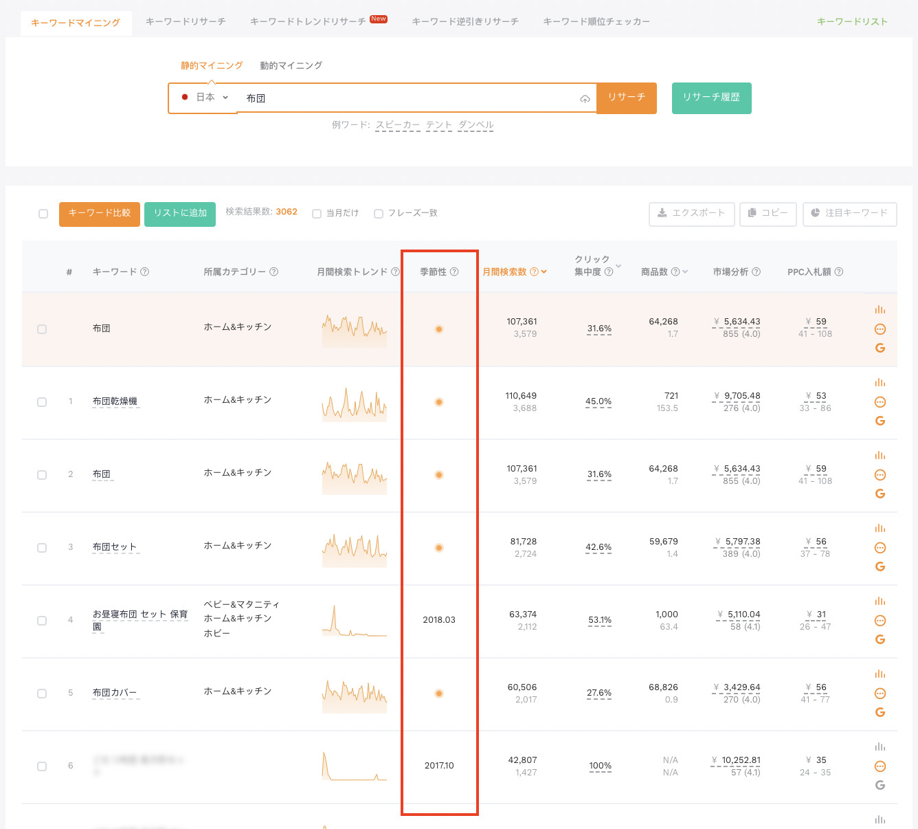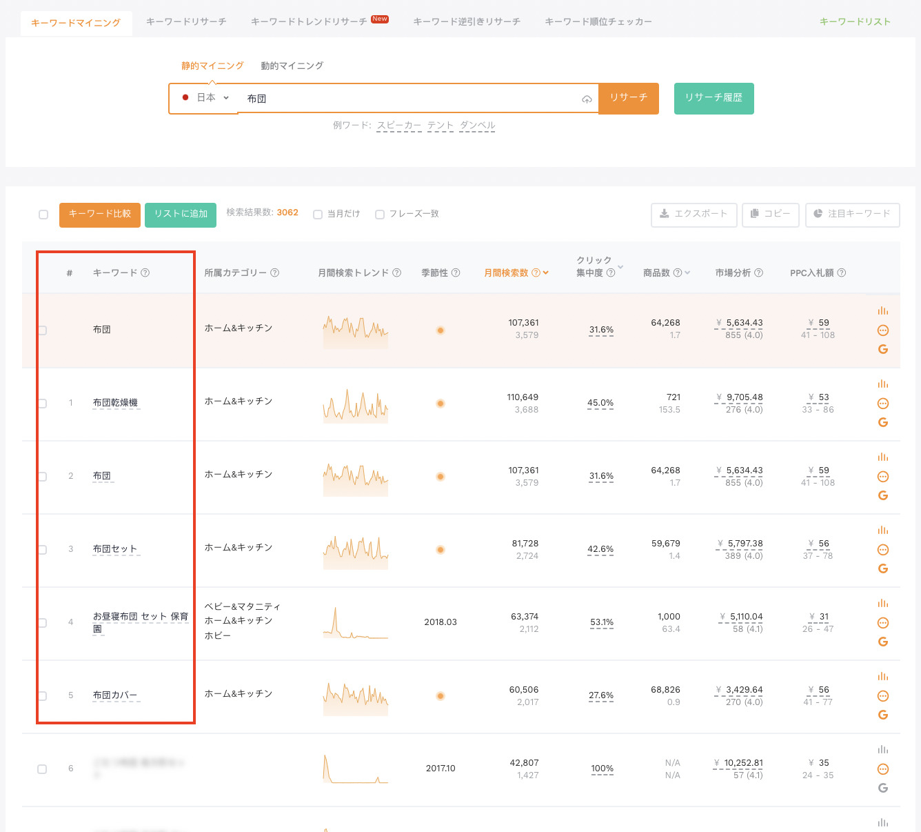 キーワードマイニングとは、関連キーワードの検索ボリュームや月間販売数を調べられる機能であり、関連キーワードの他にも共起語が表示されるので、思わずキーワードに気づけるというメリットがあります。