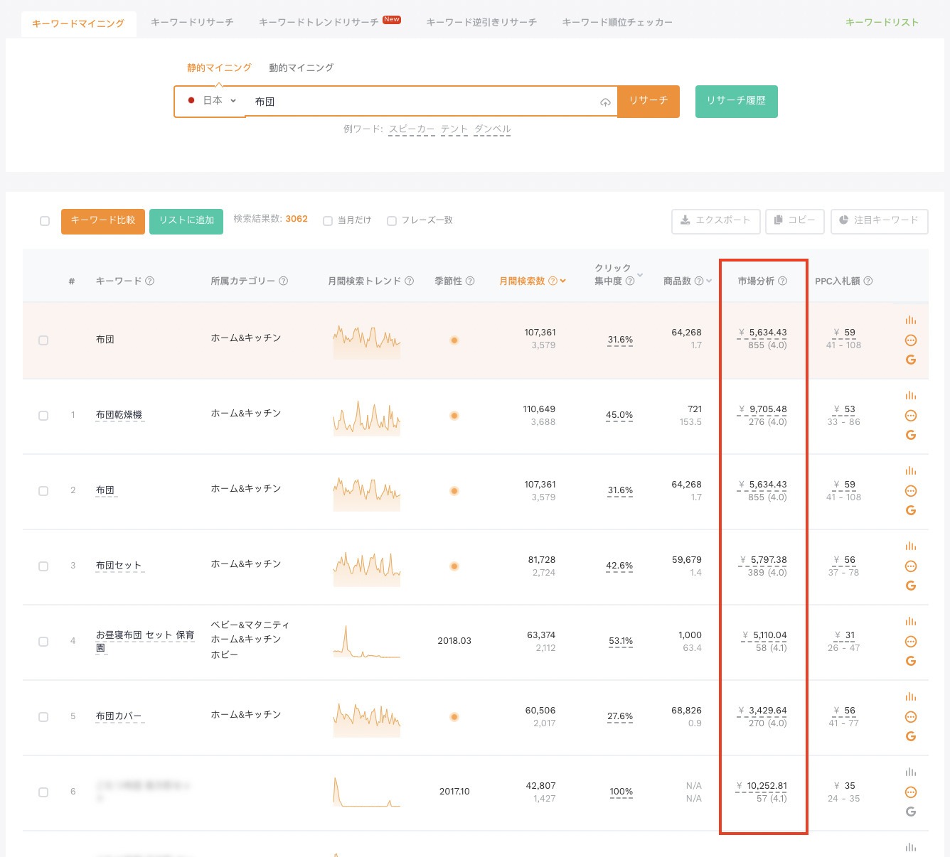市場分析とは、対象キーワードの検索結果のうち最初の3ページにある商品の平均価格、レビュー数と星評価です。