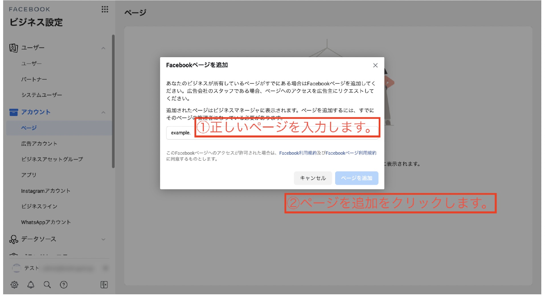 次に、広告の配信元となるFacebookページをBusiness Suiteに追加します。同じく「ビジネス設定」の「アカウント」セクション内にある「ページ」を選択します。