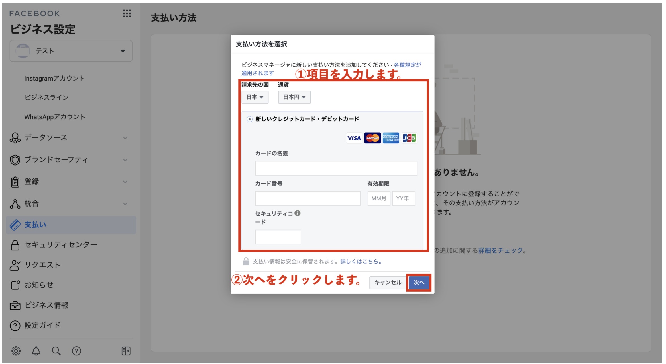 - 「次へ」をクリックし、指示に従って操作を完了させます。これでBusiness Suiteに支払い方法が登録されました。