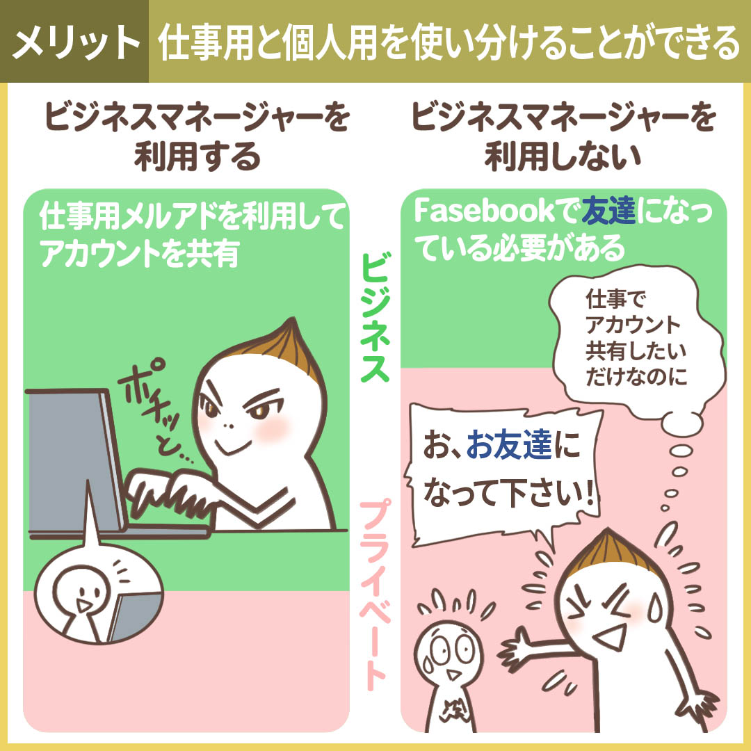 Business Suiteを導入する最大のメリットは、ビジネス活動と個人のプライベートな領域を完全に分離できる点にあります。従来、Facebookページの管理権限や広告アカウントへのアクセス権を共有するためには、個人のFacebookアカウントで「友達」になることが必要でした。これは、仕事上の関係者とプライベートで繋がることに抵抗があるだけでなく、深刻なビジネスリスクを内包していました。