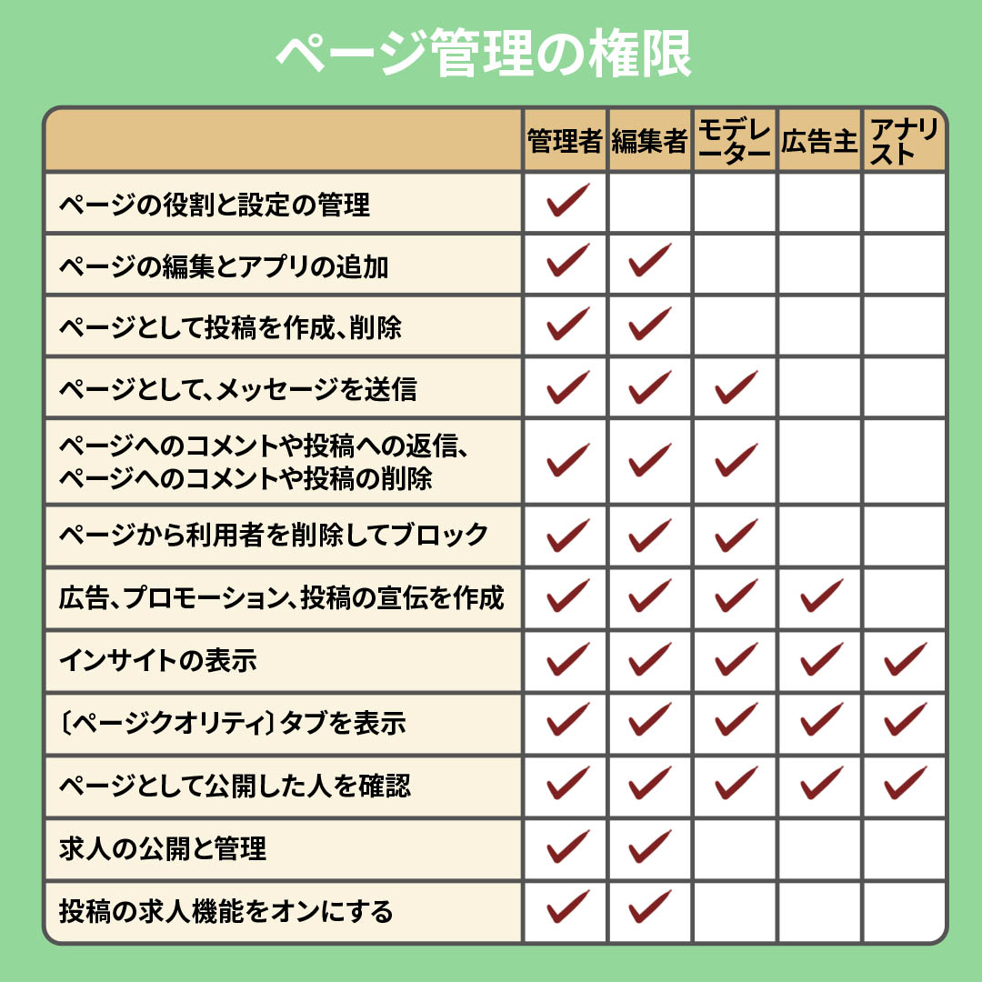 - 管理者: ページの役割管理、設定変更、投稿、メッセージ送信、広告作成、インサイト閲覧など、すべての操作が可能です。