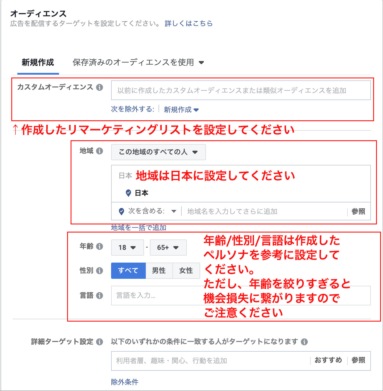 上記のようにFacebookリターゲティング広告では、ターゲットリストを活用してユーザーへ広告を絞った配信ができます。