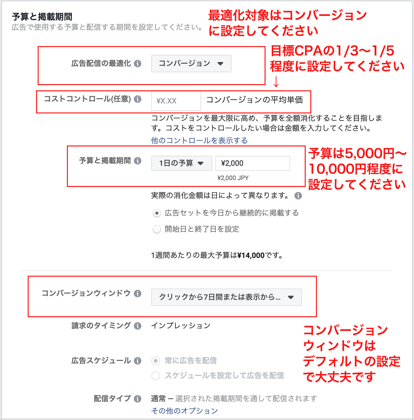 Facebookリターゲティング広告を利用するにあたって注意しておきたいのは、ユーザーに「何度も広告を配信してしまう」ことです。自社に対して興味、認知のあるユーザーに絞っての配信で高いコンバージョンが期待できるFacebookリターゲティング広告ですが、何度も多数に渡って繰り返し配信されてしまうと、自社へ対する不信感を与えかねません。そのような事態を避けるために以下の設定を行うことをお勧めします。