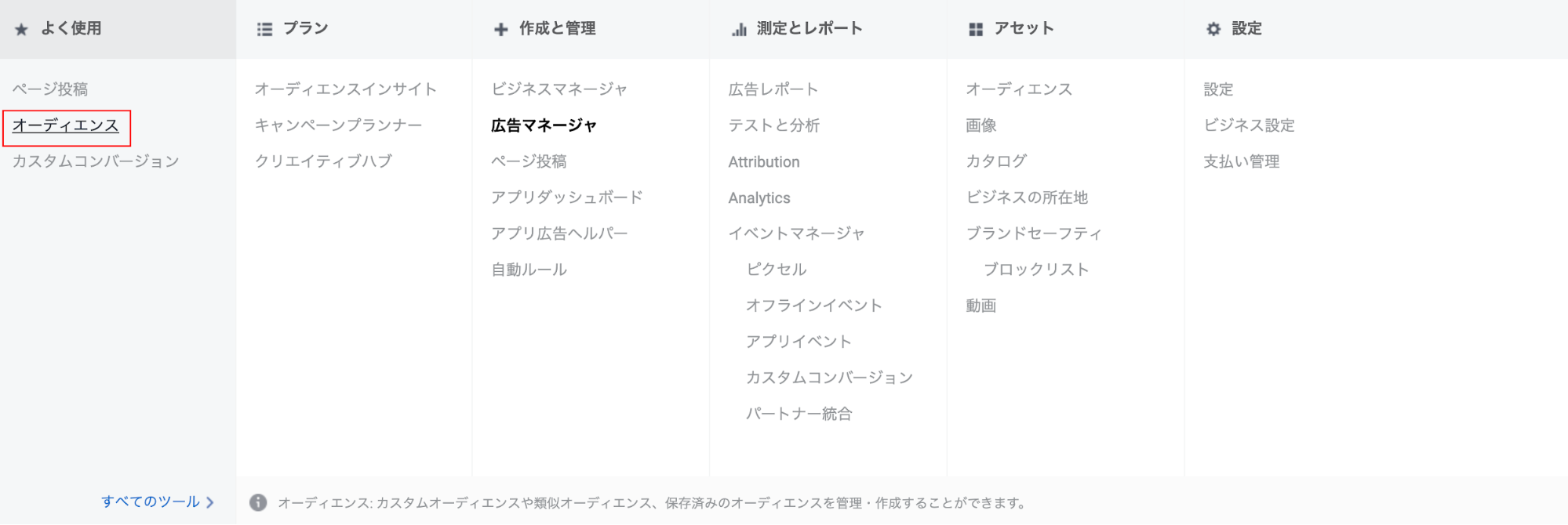 広告マネージャから、オーディエンスに移動します。