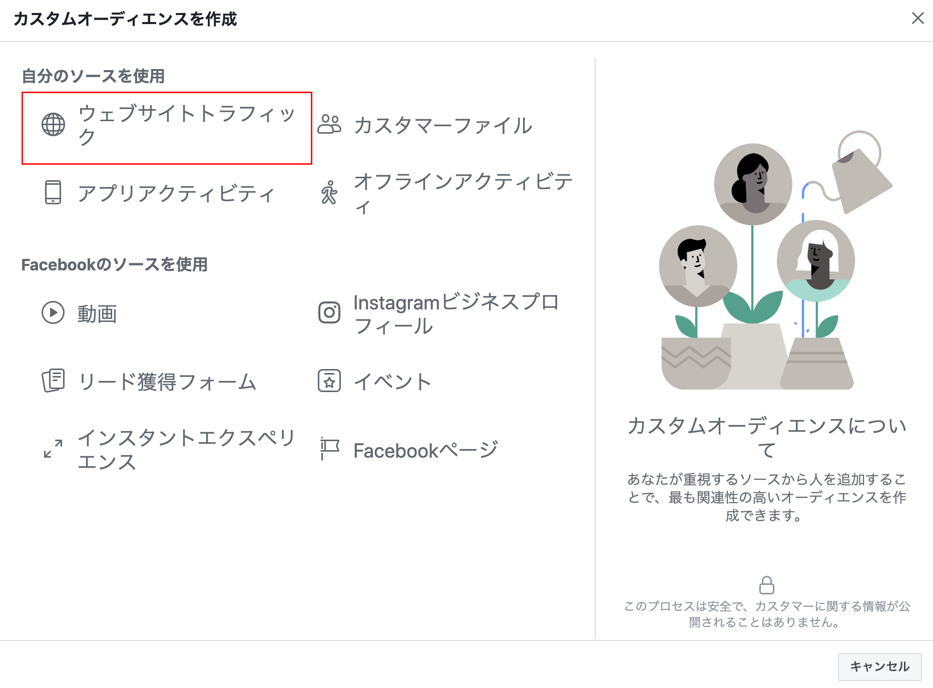 カスタムオーディエンスをクリックし、「ウェブサイトトラフィック」を選択してください。