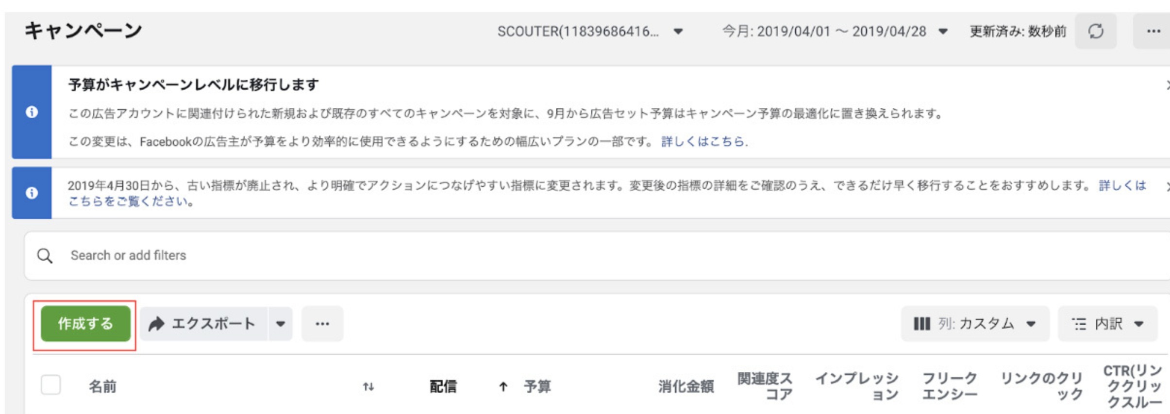 広告マネージャに移動し、「作成する」をクリックしてください。