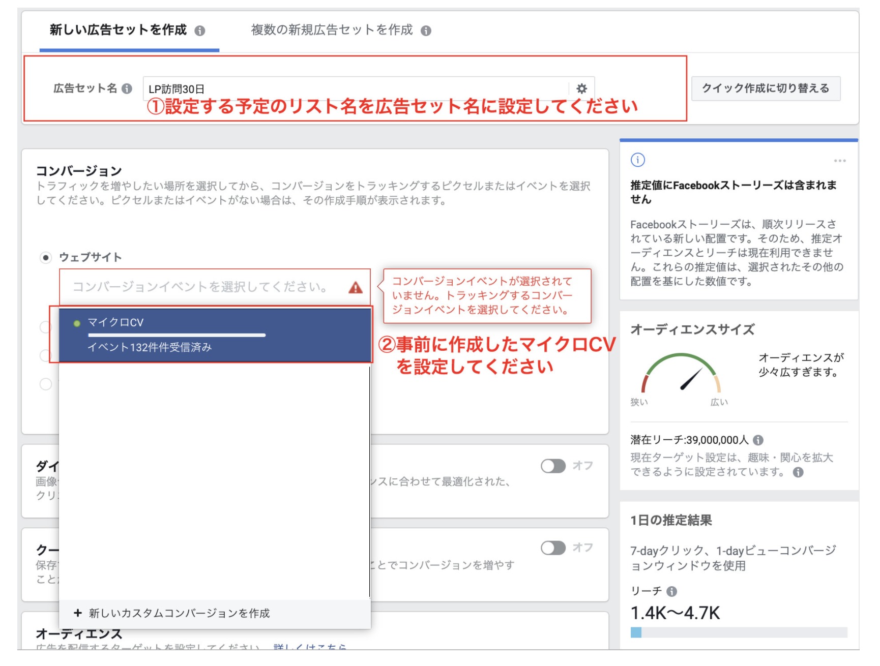 Googleに比べて、自動入札機能が優れていること、リストが枯れやすいことから、広告文やLPの出しわけをリーセンシーごとに行わない場合には、広告セットに指定のリストを一括で設定してしまって問題ありません。