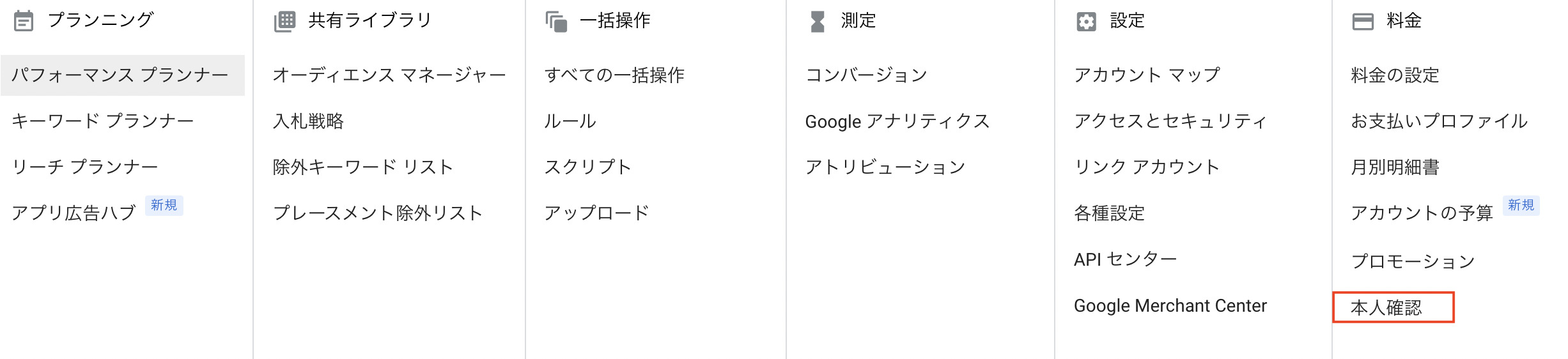 1.まず初めにGoogle広告にログインし、管理画面のツールの料金から本人確認を選択します。