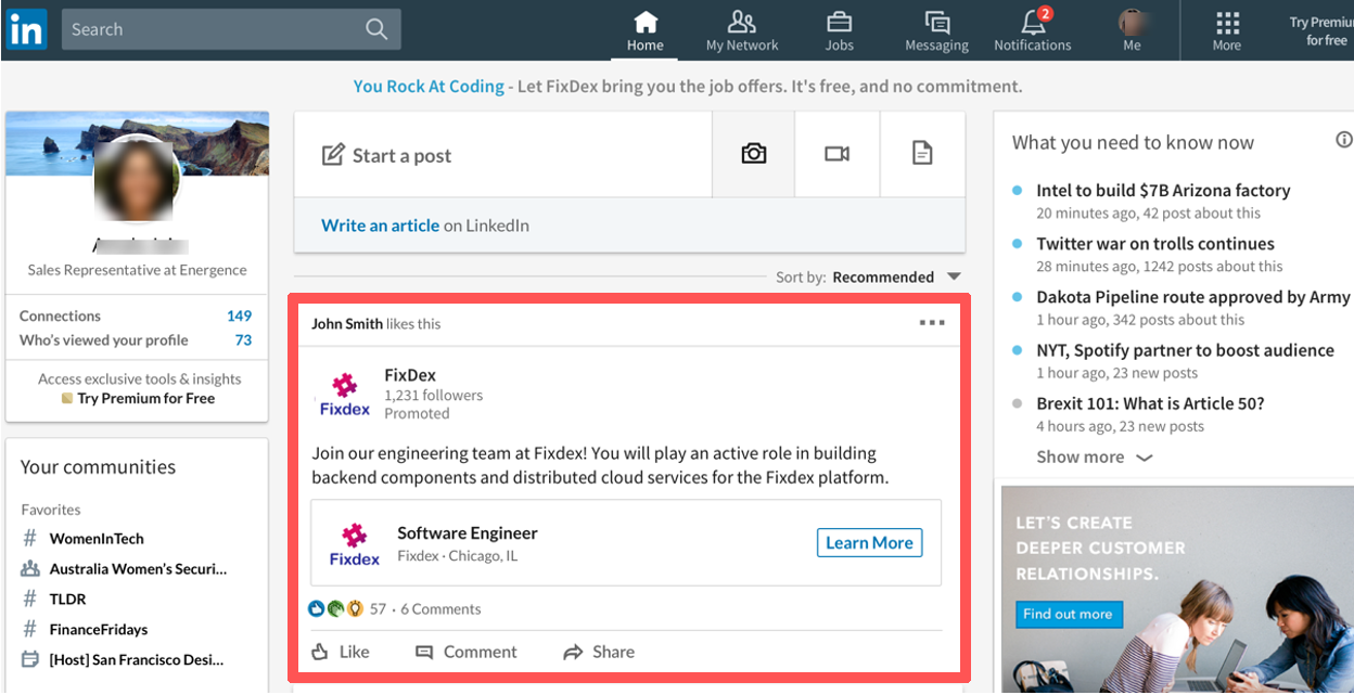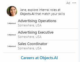 ダイナミック広告のカテゴリーにおける求人広告は、前述のスポンサードコンテンツの「シングル求人広告」と目的は同じですが、アプローチの方法が異なります。こちらは、ユーザーのプロフィール情報を活用して、「〇〇さん、あなたのスキル(例:Java, PMP)は、弊社のこのポジションで活かせます」といった形で、極めてパーソナライズされた求人情報を提示します。ユーザーのプロフィールに記載されているスキルや経験と、募集しているポジションの要件が合致した場合に広告が表示されるため、候補者にとっては「自分に関係のある、特別なオファー」として認識されやすくなります。特に、企業側が積極的に採用していることをアピールしたい場合、「Jobs at (会社名)」や「See jobs」といったCTAが表示され、クリックすると企業の求人一覧ページへ誘導します。この広告は、転職を積極的に考えていない潜在層に対して、自社への興味を喚起し、「少し話を聞いてみようか」と思わせるきっかけを作るのに非常に有効です。ダイナミックなパーソナライゼーションにより、その他大勢向けの求人広告との差別化を図り、優秀な人材の獲得競争を有利に進めることが可能になります。