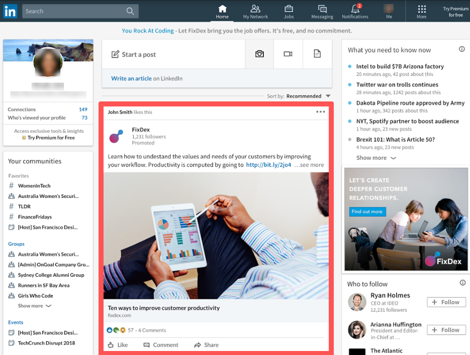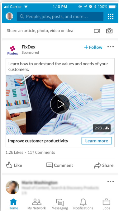 ここはLinkedIn広告において最も主要かつ効果的な配信先です。ユーザーが最も多くの時間を費やすホームページのメインフィード(タイムライン)上に、他のユーザーや企業によるオーガニックな投稿(通常の投稿)と混ざり合う形で広告が表示されます。この「ネイティブ広告」としての性質が極めて重要で、ユーザーのコンテンツ閲覧体験を妨げることなく、自然な形で情報を提供することが可能です。画像や動画、カルーセルといったリッチなクリエイティブを活用できるため、製品のデモンストレーション動画を配信して具体的な利用イメージを伝えたり、導入事例をまとめたホワイトペーパーのダウンロードを促したりと、リード獲得に直結する多様な訴求が展開できます。特にモバイルデバイスでの閲覧時は、画面占有率が高くなるためユーザーの注目を集めやすく、質の高いエンゲージメントが期待できます。また、PC版ではタイムラインの上部にテキスト形式の広告が固定で表示される場合もあり、常にユーザーの目に入る場所で簡潔なメッセージを伝えたい場合に有効です。この配信先は、視覚的な訴求力と情報量を両立させ、ターゲットの検討段階を先に進めるための強力な一手となり得ます。