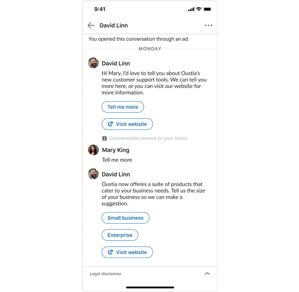 メッセージ広告は、スポンサードメッセージの基本的なフォーマットです。送信者(企業や担当者)からターゲットユーザー個人宛に、一つの完結したメッセージを送信します。メッセージ本文には最大500文字程度のテキストを入力でき、製品紹介やサービス案内、イベントへの招待、資料ダウンロードの依頼など、様々な内容を盛り込むことができます。このフォーマットの重要な特徴は、メッセージ内に必ず一つの明確な「コールトゥアクション(CTA)ボタン」を設置する点です。ユーザーがこのボタンをクリックすると、指定したランディングページ(ウェブサイト、資料請求フォームなど)に直接遷移します。つまり、メッセージ内での複数回のやり取りを前提とせず、ユーザーを次のアクションへ一直線に誘導することに特化しています。例えば、「弊社の新サービスが、貴社の◯◯という課題を解決できるかもしれません。詳細は以下のボタンからご覧ください」といった形で、簡潔に価値提案を行い、スムーズに自社サイトへ誘導する、といった使い方が典型的です。メッセージの送信元を、企業ページだけでなく、営業担当者や採用担当者の個人アカウントに設定することも可能で、個人名で送ることで、よりパーソナルで信頼性の高いコミュニケーションを演出できます。