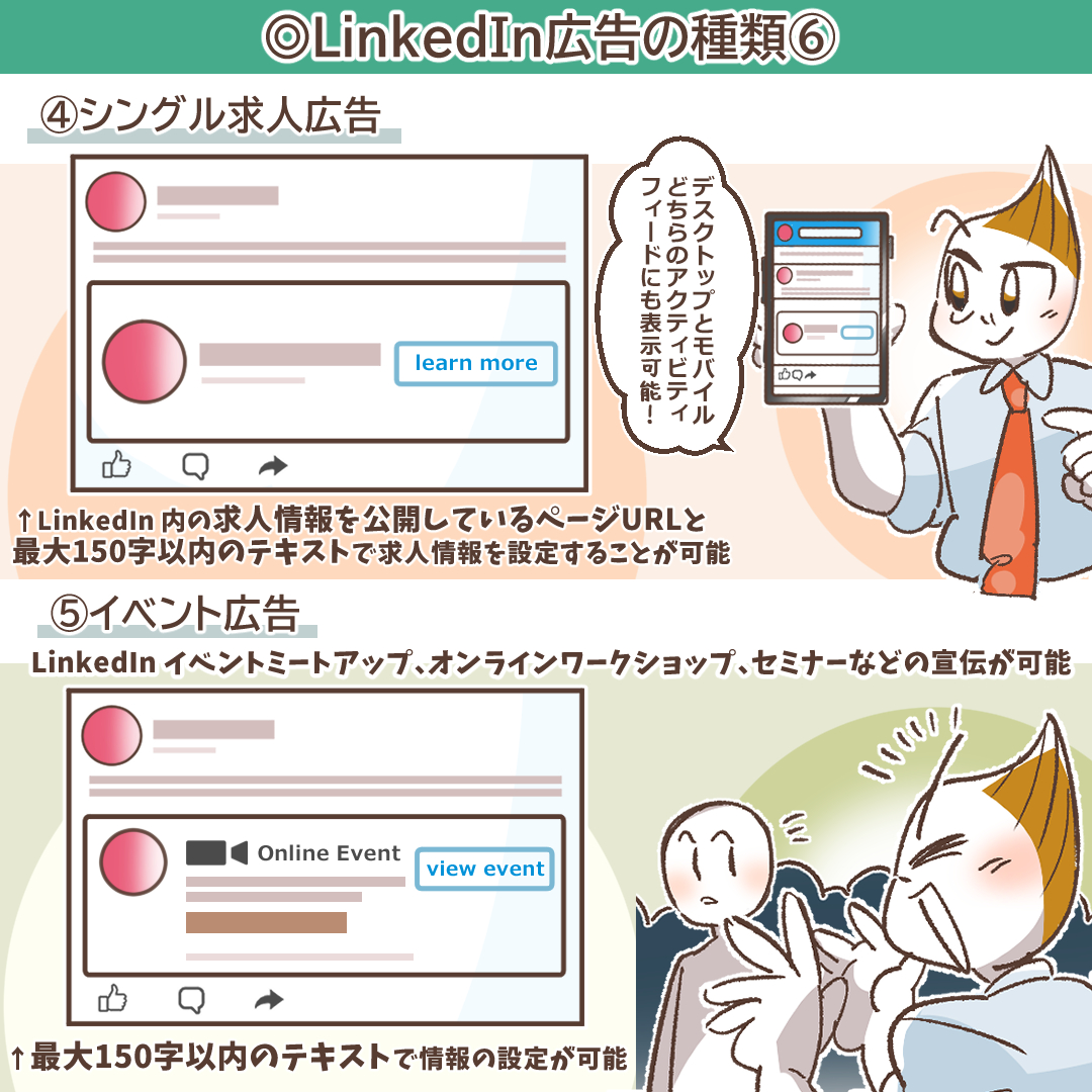 イベント広告は、企業が主催するオンラインまたはオフラインのイベント(ウェビナー、セミナー、製品発表会、ミートアップなど)への参加者を集めることを目的とした広告フォーマットです。イベントへの集客は、質の高い見込み顧客を獲得するための非常に有効な手段であり、この広告はそれを強力に後押しします。LinkedIn上で作成したイベントページと連携し、イベントのタイトル、日時、内容などをタイムラインフィード上で告知することができます。シングル求人広告と同様に、イベントのテーマに興味を持ちそうな業界や役職、スキルを持つユーザーを正確にターゲティングできるため、無関係なユーザーへの無駄な広告表示を避け、関心の高い層に効率的にアプローチできます。例えば、マーケティングオートメーションに関するウェビナーであれば、企業のマーケティング担当者やマネージャー層にターゲットを絞って広告を配信することで、参加率と、その後の商談化率を高めることが可能です。広告は最大150字のテキストでイベントの魅力を伝え、ユーザーは広告上のボタンから直接イベントページに遷移し、参加登録を行うことができます。このシームレスな導線設計が、参加登録というコンバージョンを最大化する上で重要な役割を果たします。