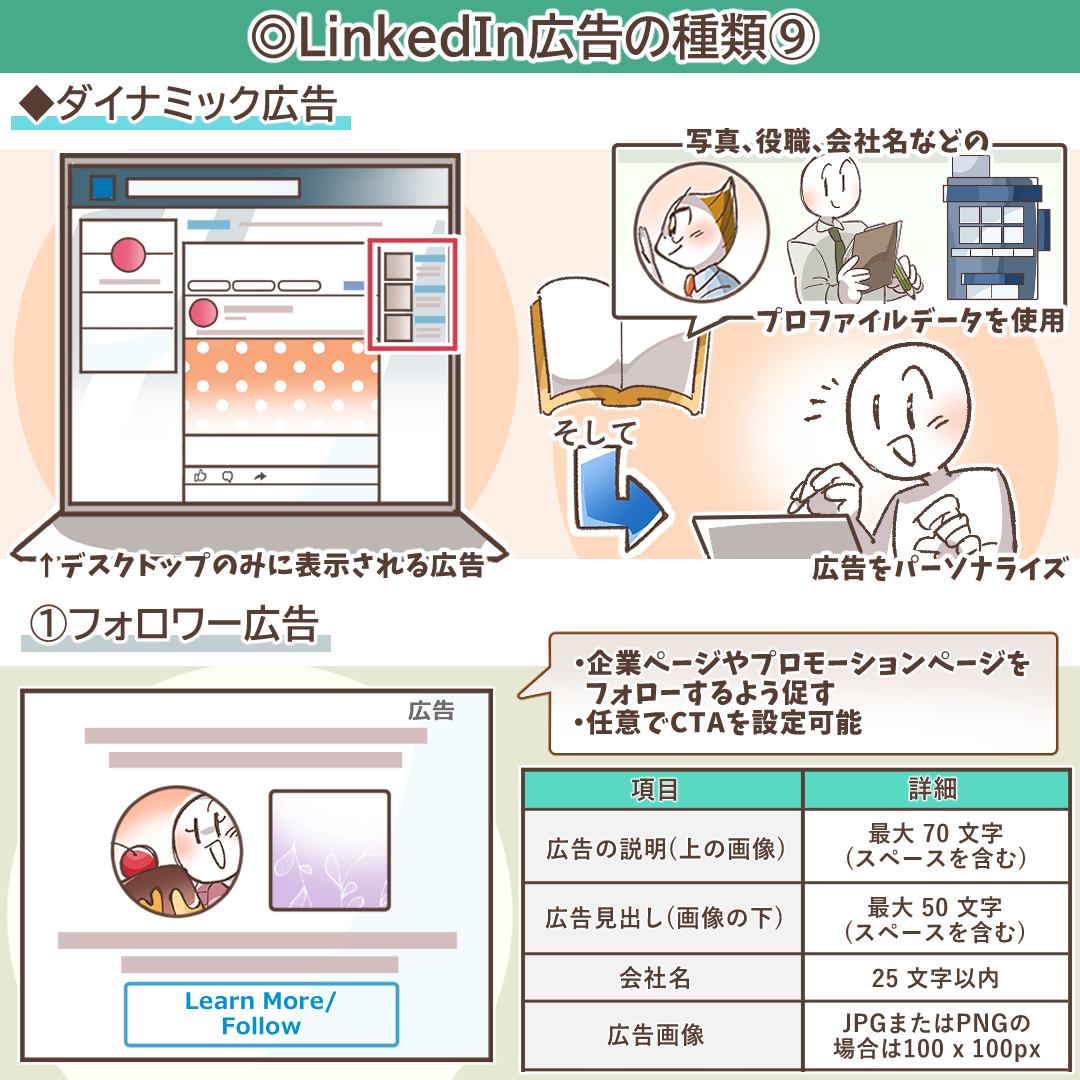 フォロワー広告の仕様は以下の通りです。簡潔なテキストで、フォローすることのメリットを明確に伝えることが重要です。