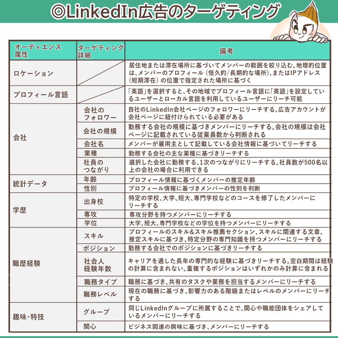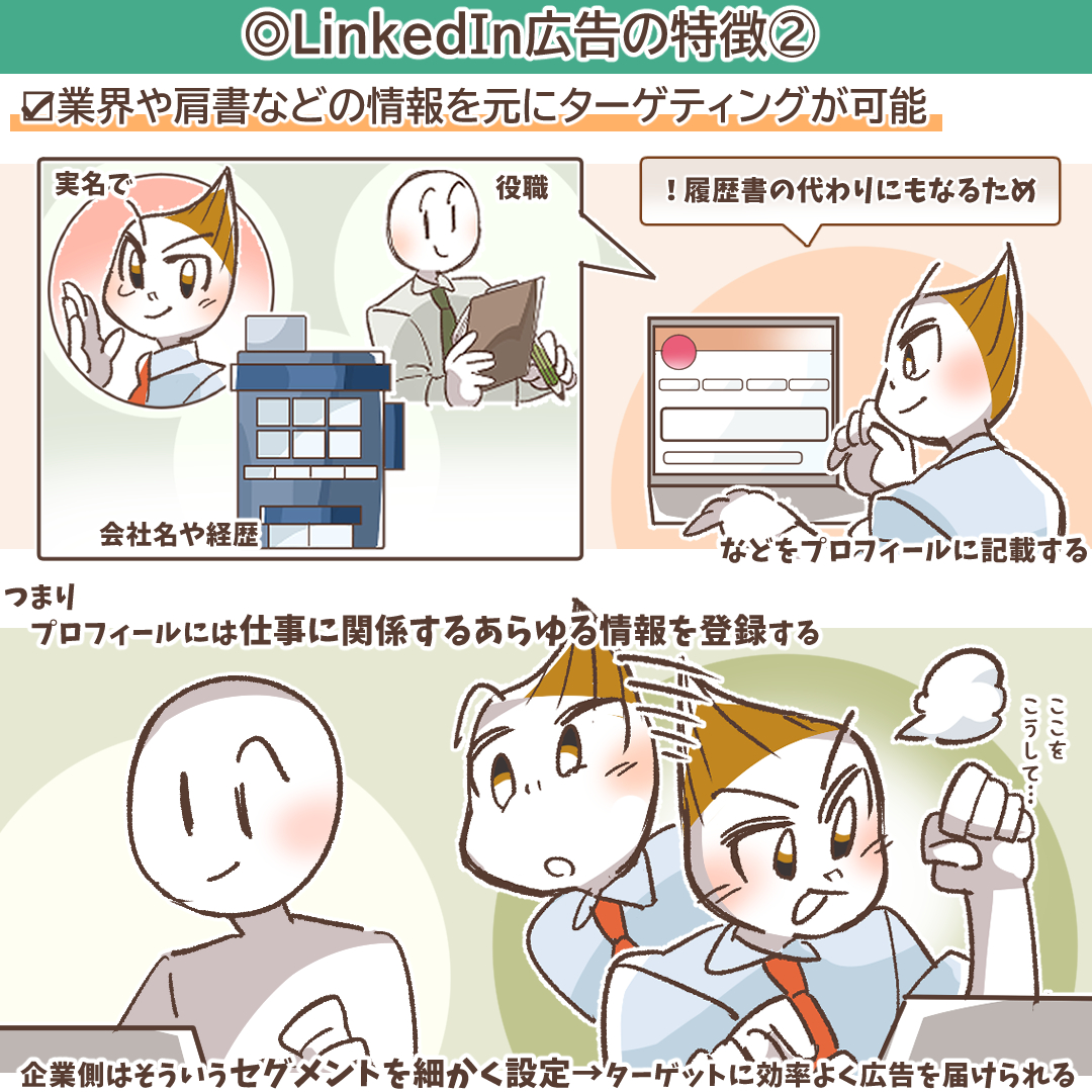 前述の通り、LinkedIn広告の優位性を決定づけるのが、そのターゲティング機能の精度と深度です。ユーザーは自身のキャリアを公にするプラットフォームであるため、プロフィールに登録する情報(会社名、業種、役職、職務、スキル、学歴など)は、信頼性が極めて高いという特徴があります。特に海外では名刺や履歴書の代わりとして利用されることも多く、虚偽の情報を記載することは自身の信用問題に直結します。広告主は、この正確なファーストパーティデータを活用し、自社の理想的な顧客像(ペルソナ)や採用候補者像に合致するオーディエンスを、ピンポイントで狙い撃ちすることが可能です。例えば、「金融業界で、従業員1,000名以上の企業に勤務する、サイバーセキュリティに関心を持つIT部長」といった、複数の条件を組み合わせた複雑なセグメントを作成できます。これにより、広告予算を無関係なユーザーに費やすことなく、最も可能性の高いターゲットに集中投下できるため、結果として一人当たりの獲得単価(CPA)を大幅に抑制し、高い費用対効果を実現します。このビジネス属性に基づいたターゲティング精度こそが、LinkedIn広告をBtoBマーケティングにおける「必携ツール」たらしめている最大の理由です。